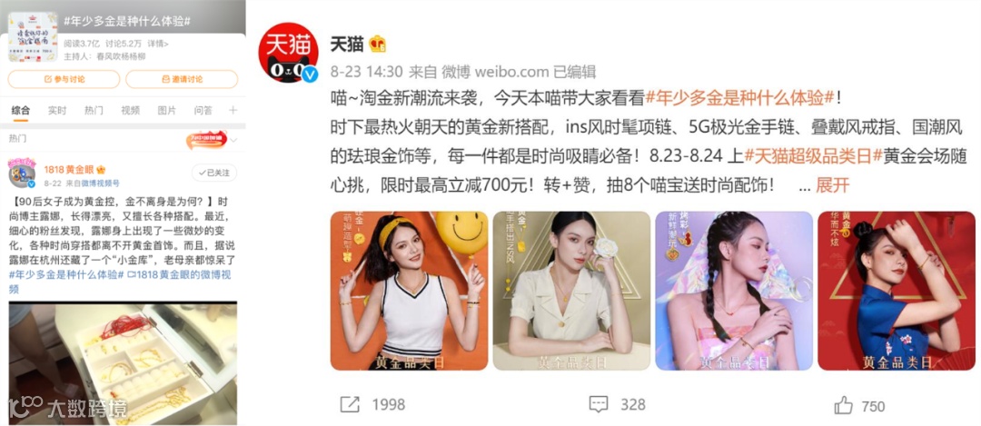 而后,顺势发起#年少多金是种什么体验#话题,引起网友对穿戴黄金的话题讨论,并同时展开多维度的内容种草,进一步带出5G、古法、珐琅、3D四大黄金新工艺的趋势升级点,强势种草黄金首饰单品,将关注与流量导流回站内,形成闭环式传播。