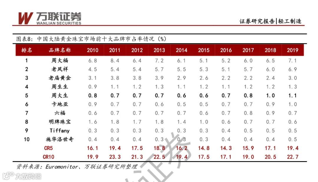 像大家耳熟能详的周大福、周六福、老庙黄金、六福珠宝、周生生、周大生、老凤祥、TSL谢瑞麟、明牌珠宝、中国黄金、潮宏基珠宝等众多黄金品牌在整个黄金品类市场上都占据着较大的市场份额。