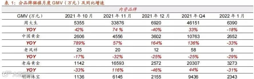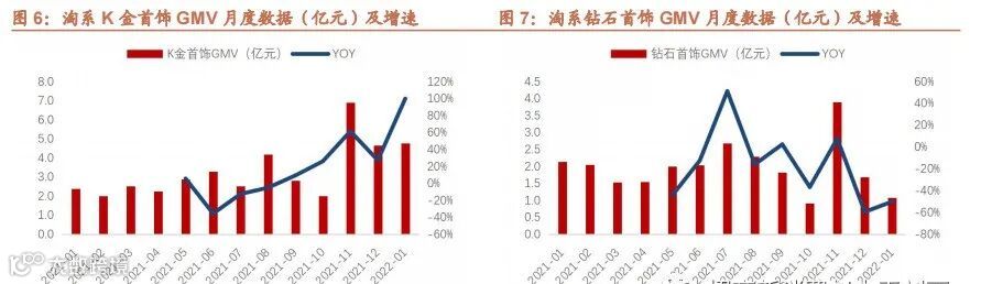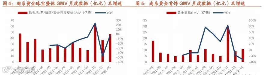 据第三方平台数据显示,22年1月淘系黄金珠宝整体GMV合计47.2亿元,同比下降2%。其中,黄金首饰GMV为10.9亿元,同比下降32%;K金首饰GMV为4.8亿元,同比增长100%;钻石首饰GMV为1.1亿元,同比下降50%。2022年1月K金消费热情持续高涨,但淘系黄金珠宝整体GMV仍然保持双十一之前的微降状态,其中黄金首饰和钻石首饰GMV下滑幅度大。