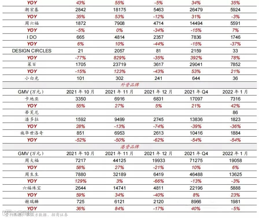 从天猫旗舰店表现来看,不管是内资、港资还是海外品牌,黄金珠宝行业品牌销售2022年1月整体表现平平,但行业内部各品牌保持较为明显的分化态势。内资品牌中,DESIGN CIRCLES、明牌珠宝、菜百在2022年1月GMV同比增速较高,分别为78%、35%、21%;周六福、潮宏基同比变化幅度相对较小,分别为7%、-3%;周大生、老凤祥、老庙黄金、中国黄金、I DO分别实现了-18%、-29%、-31%、-33%、-37%的下降,GMV下滑幅度较大。