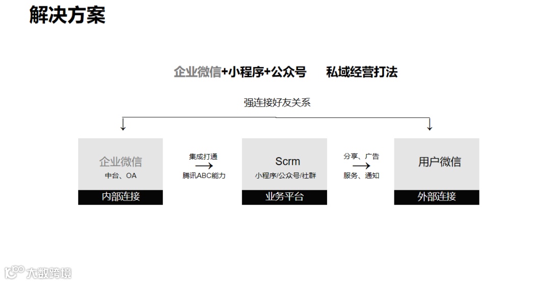 解决方案: 在为门店搭建线上门店的同时,提供一套完整的、可执行的“获客、转化、留存、复购、裂变”门店数字化运营解决方案,精细化运营打造核心竞争力