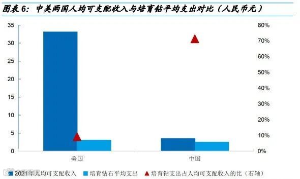 对比中美两国培育钻平均支出占人均可支配收入的比,也可以看出消费人群的差异。2021年美国人均可支配收入4.82万美元,Tenoris统计的培育钻平均单品支出4383美元,单品培育钻石消费占全年人均可支配收入的9%、对普通消费者购买压力较小。根据我们调研,中国培育钻石门店主流消费分数段在1克拉、人均预算2-3万元,占中国2021年人均可支配收入的71%,中国的培育钻石消费集中在一二线城市高购买力人群。