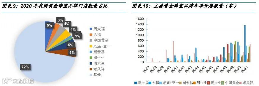 疫情加速行业洗牌,具备优质加盟商资源&运营管理能力的品牌近年来加速开店、提升份额。门店数量为品牌核心竞争力之一。今年以来中国黄金、潮宏基、曼卡龙、豫园股份等陆续布局培育钻石零售、进行线上线下布局,头部品牌门店数量、开店速度远超行业,随集中度提升,其培育钻石业务具备做大空间。