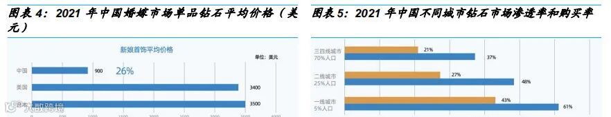 目前培育钻石品牌门店主要开设在一二线城市,面向消费力较高的人群。根据上海钻交所和De beers,2021年中国婚嫁市场单品钻石平均价格在900美元,仅为美国和日本平均单价的26%,主要系占据全国70%人口的三四线城市钻石消费渗透率、购买力较低。