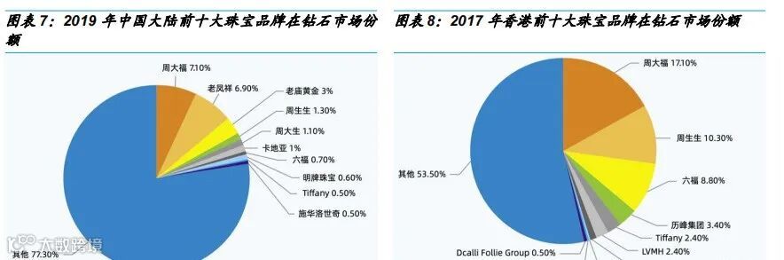 中国大陆钻石市场集中度较低,根据上海钻交所《2021年中国钻石年鉴》,2019年前十大品牌CR10为22.7%,发展相对成熟的香港市场2017年CR10已达47%。