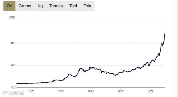 从上世纪70年代初到80年代初,受美元走软、通胀等因素影响,美联储印钞方式并未改善失业率,却导致滞胀。黄金价格曾由70年代初的35美元/盎司一度升到850美元/盎司(1980年1月21日),涨幅超过2300%。