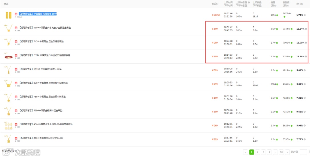 直播上架173件商品,总销量46.9万!其中「胡海泉专享」中国黄金投资金条50克--销售额达3600多万,排名第一,其次就是足金吊坠之类的产品,转化率都是10%以上。