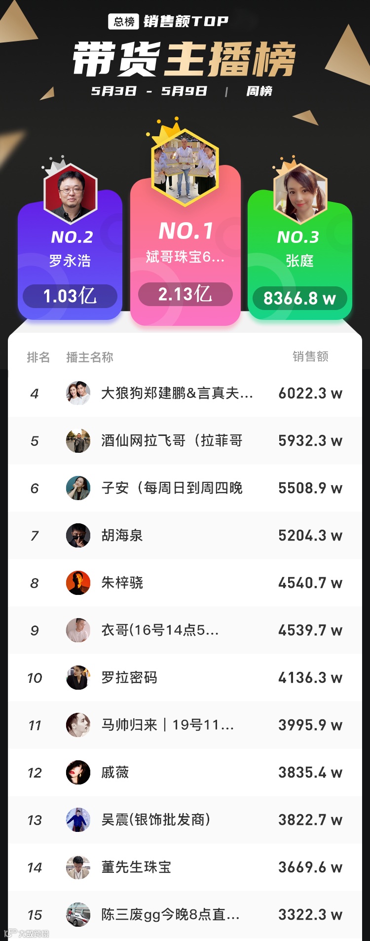 再看其他几个突然爆发的珠宝主播,五月第一周,快手珠宝红人斌哥转战抖音,战绩表现一样惊人,一周时间“斌哥珠宝617”凭借10场直播,拿下2.13亿的超高销售额。