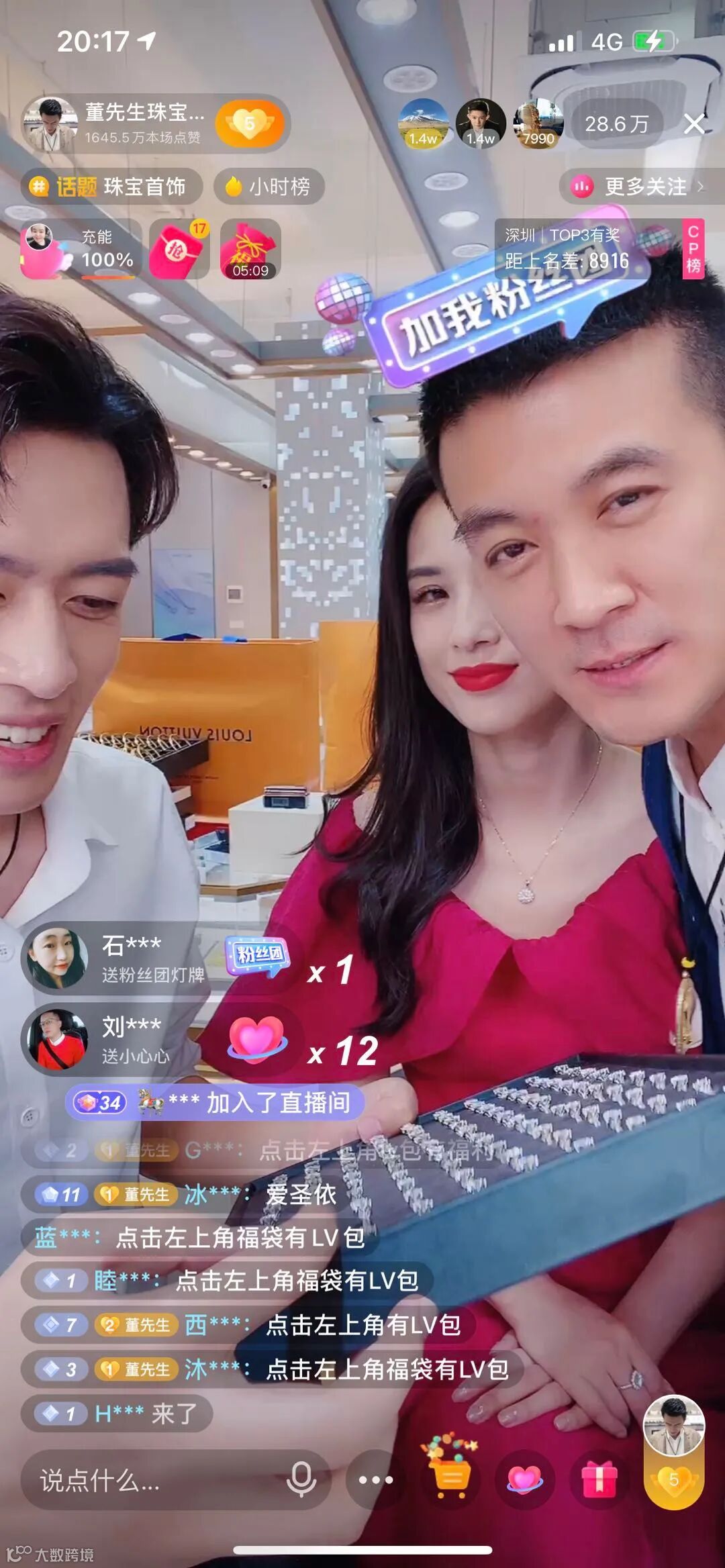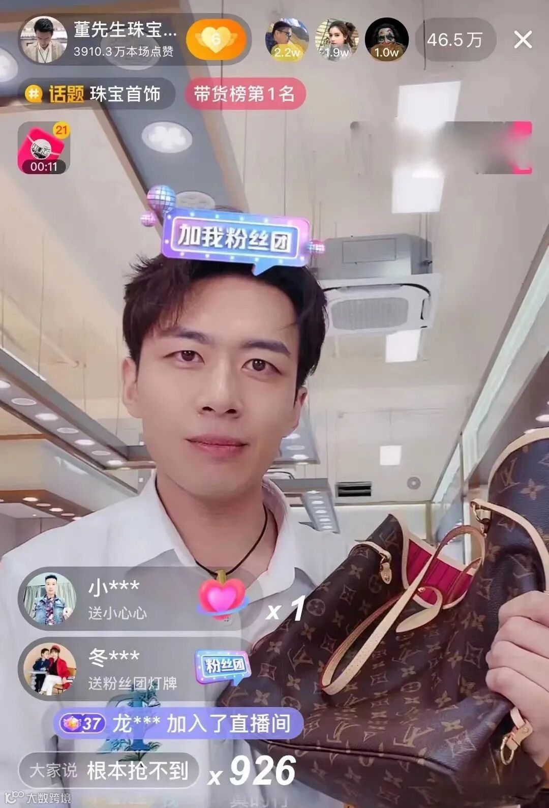 直播间赠送LV包包多达10余个,黄金手镯赠送10多个,其它各种礼物赠送累积多达50余万件。每一个数字都在刷新着珠宝类目直播的新高。