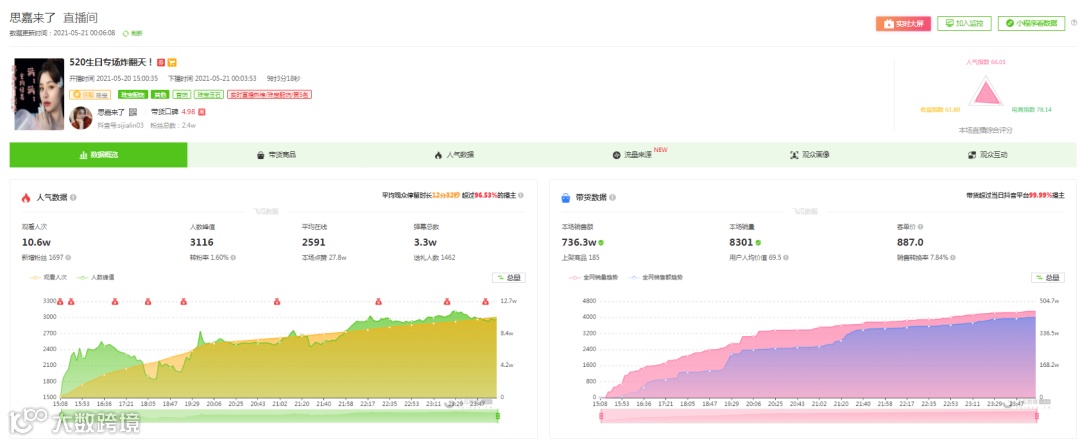 整场直播10个小时多,总计成交金额200391624元,累积观看人数达2573万多,成交订单近113万件。单品最高销售件数高达6万件,在线观看直播人数峰值达46万+,整晚稳定抖音直播间带货榜一位置。