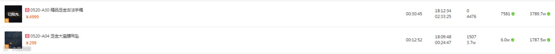 从总的带货表现上来看,客单价较高的“足金古法手镯”,总的销售额3789.7w;其次是“足金大蛮腰吊坠” ,总的销售额1787.5w;两款产品一起占据了整场销售总金额的四分之一。