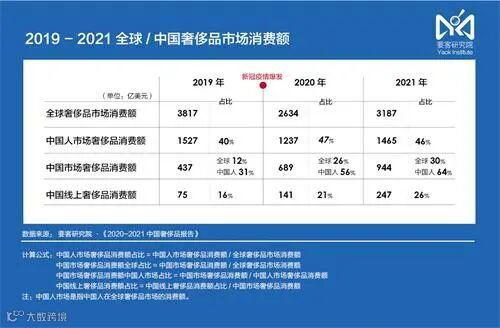 其中2021年中国人奢侈品市场同比2020年获得18%的增长,总消费额达到1465亿美元,将近1万亿人民币,在全球奢侈品市场的占比虽然降低1%,但仍然高达46%。