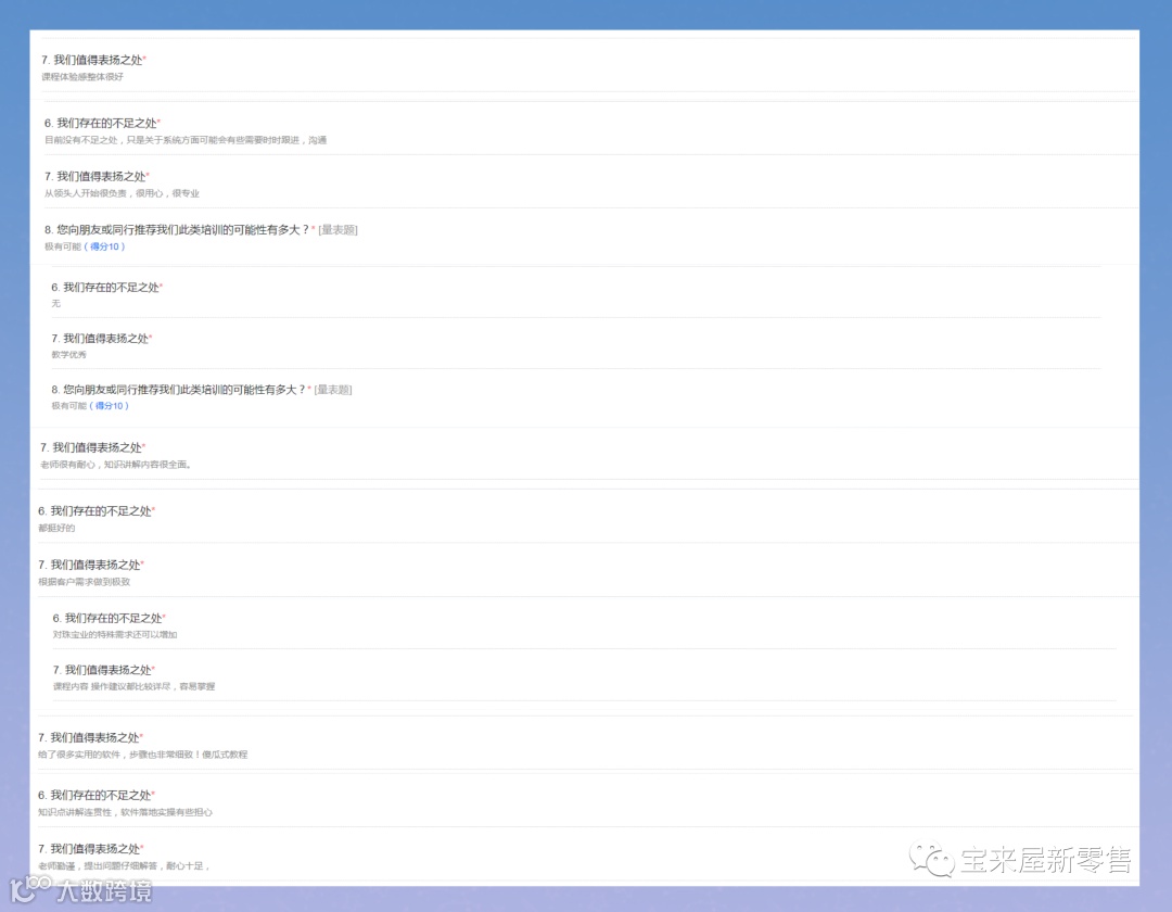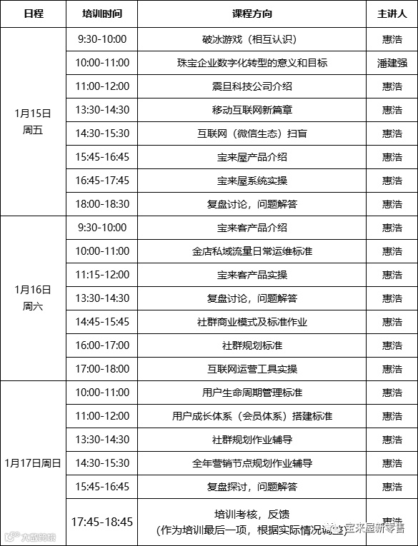 基于门店的战略发展,以移动互联网发展与珠宝企业数字化转型的意义和目标,建立对数字化这一经营理念的正确认知;基于当前门店运营存在的问题,课程围绕用户生命周期、私域流量经营管理等课程,引导门店建立一套适用于自身的运维标准;基于运营工具使用的短板,通过宝来屋、宝来客及第三方实用工具的实操,提升店员综合能力,形成系统思维。