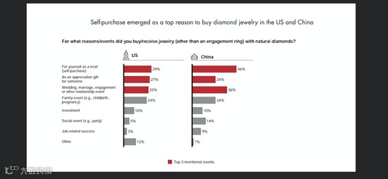而从进一步的数据分析中我们还发现,中国与美国市场不约而同得都有10%左右的受访者将钻石宝石类投资作为另一大主要的购买原因。