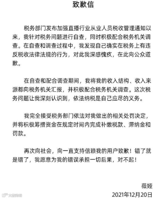就在薇娅被罚前一个月,11月22日,杭州市税务局稽查局依法向朱宸慧(网名:雪梨)、林珊珊下达税务行政处理决定书,朱宸慧(雪梨)、林珊珊两名网络主播涉嫌偷逃税款,被处1倍罚款共计近亿元。