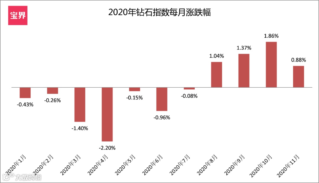 11月,钻石价格综合指数(Diamond Financial Index)小涨0.88%,虽然是连续第四个月上涨,但该指数年初至今仍下跌0.42%。