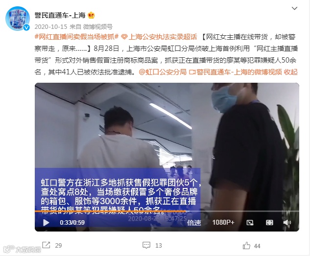据@警民直通车-上海 此前报道,去年8月时,上海市公安局虹口分局侦破上海首例利用“网红主播直播带货”形式对外销售假冒注册商标商品案,抓获正在直播带货的廖某等犯罪嫌疑人50余名,其中41人已被依法批准逮捕。