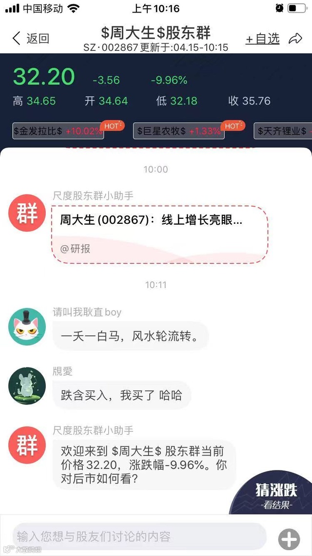 周大生跌停,让股民很是不解。在尺度APP的周大生股东群,有股民表示,一天杀一白马,风水轮流转,今天轮到了珠宝龙头?