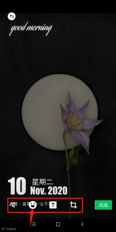 图片下面就会调出一排工具栏,分别是图画标记、添加表情、添加文字、裁剪,我们用到的是第二,添加表情