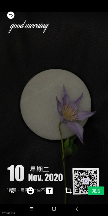 选择完之后,二维码图片就出现在图片了。我们可以自由移动位置和缩放大小。调整到合适的位置,点击右下角“完成”,就可以选择保存或者是发送给他人