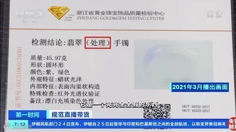 黎女士称,浙江省黄金珠宝饰品质量检验中心给出的检测结果是,它是翡翠经过处理的手镯,它经过酸化、填充颜色,是一个完完全全假的东西。