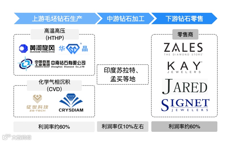 从产业链结构来看,信达证券指出,培育钻石产业链呈现出明显的集中性,上游中国占有全球产量的42.9%,中游印度消化了全球90%以上的钻石加工需求,下游美国占有全球80%的培育钻石市场。