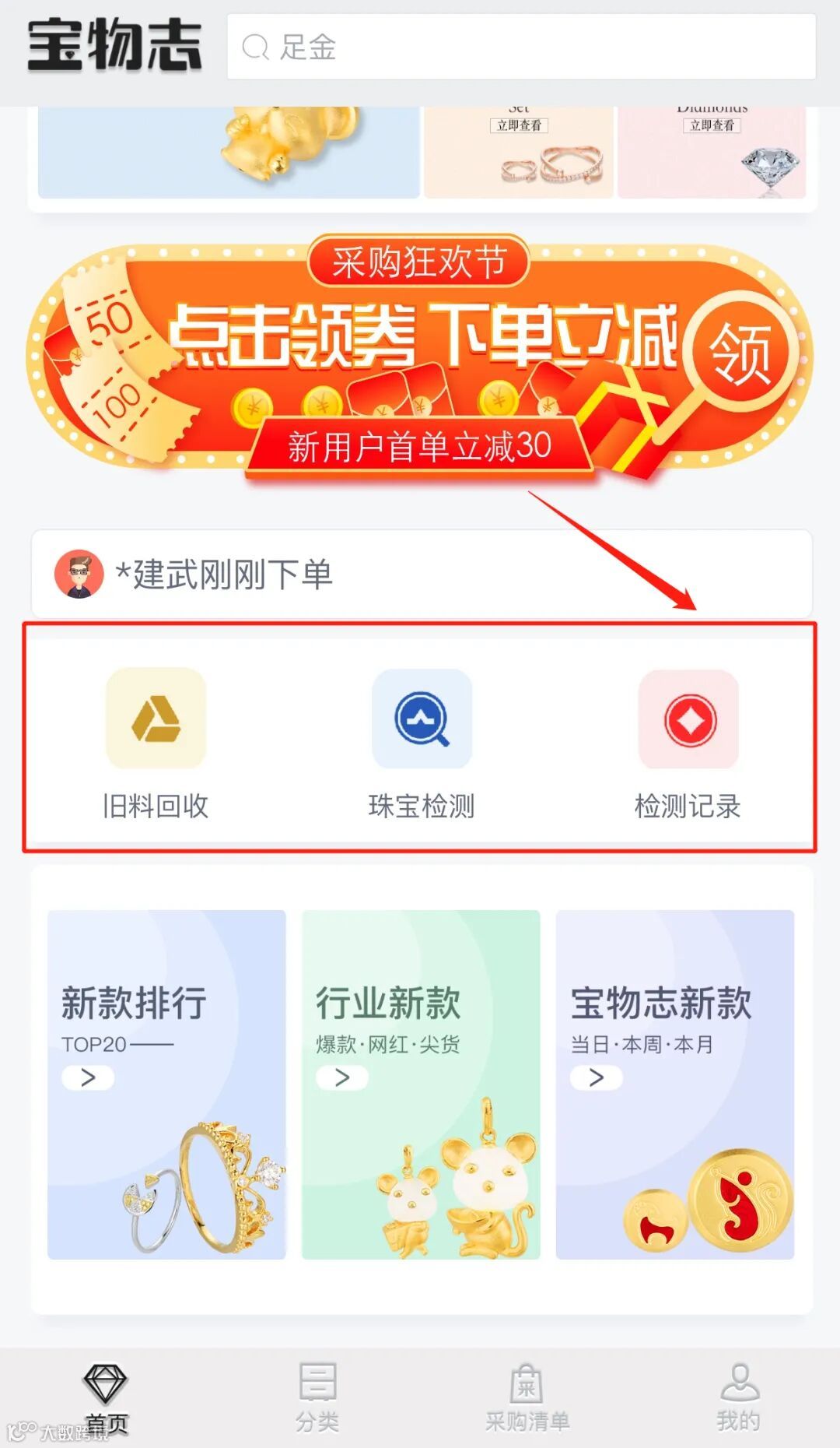 下载或更新最新版宝物志APP,打开APP首页,选择“珠宝检测”。
