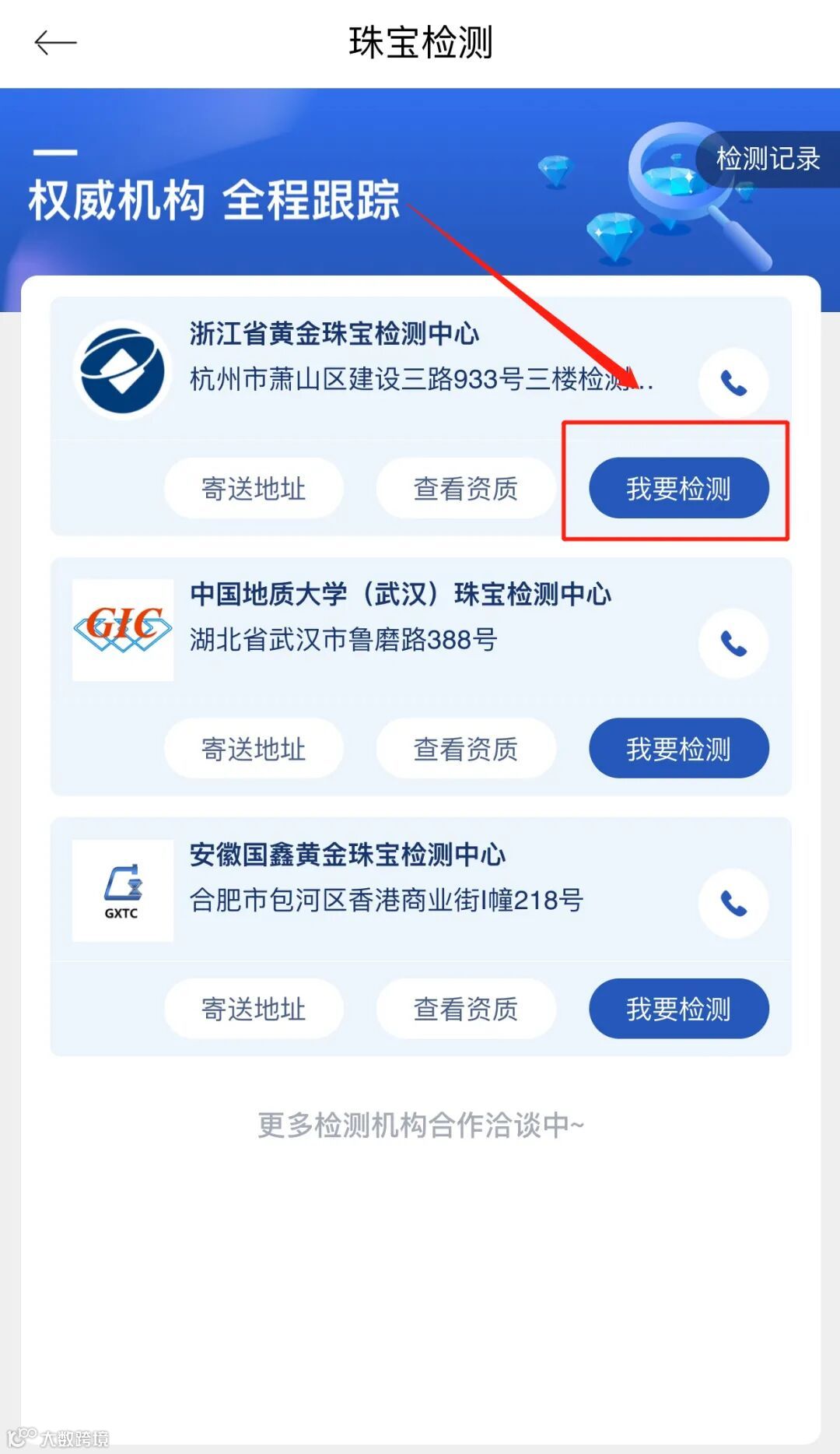 选择任意一家权威检测机构,点击“我要送检”。通过“查看资质”和“寄送地址”可以了解检测机构的相关资料。
