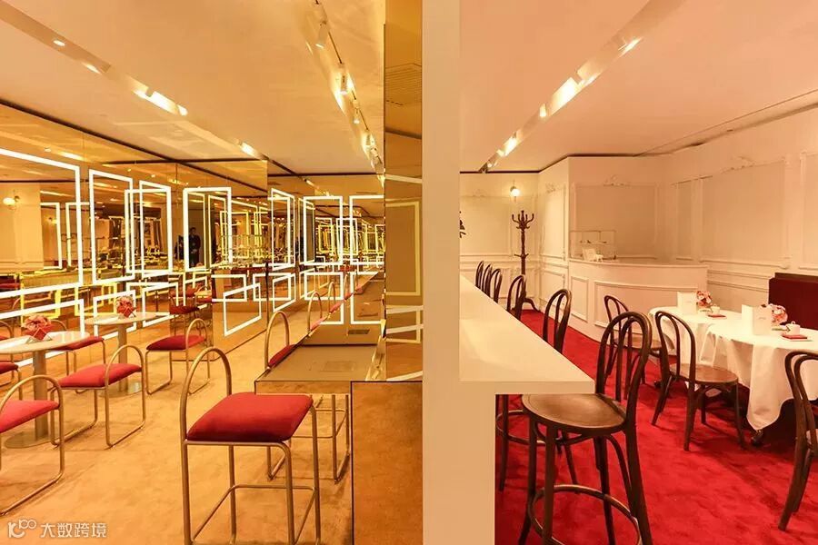 体验展以咖啡馆的形式进行。这家卡地亚咖啡馆的室内设计考究又特别。一边是摩登的金色镜面空间,另一边则是优雅的法式咖啡馆风格。