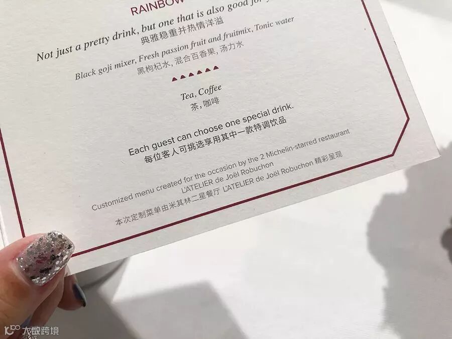 菜单由米其林二星餐厅 L'ATELIER de Joel Robuchon 专门为这次展览定制的。甜品和饮品中融入了卡地亚标志性的元素:豹子头、红色、Clash de Cartier 珠宝的铆钉……