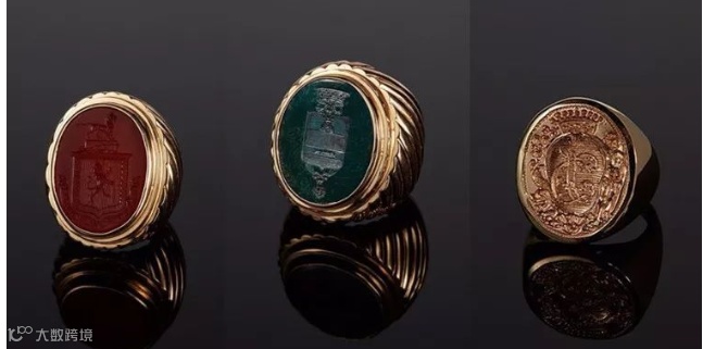 类似的文字戒在古代欧洲被称为“签名戒”,戒面又宽又大,在上面雕刻主人的姓氏或者姓名的简写,有的还刻有徽纹(家族徽号),基本都是贵族佩戴的。
