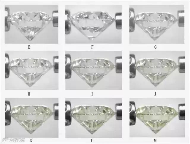 GIA钻石颜色分级标准中,E级至F级指的是完全无色;G级到J级指的近无色;在这个等级范围内的钻石,从桌面观察无色,由侧面看会略带黄色;K级到M级为极微黄色,此等级的钻石,由正面看略带黄色,侧面看明显带黄色;N级至级的钻石镶好后,即使外行人也可看出其黄色调。超过Z级的则属彩色钻石,其颜色等级不能按此无色系列来分。
