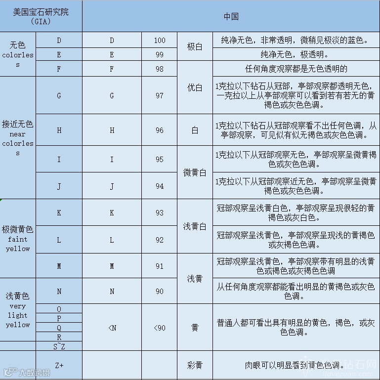 其中D为最高等级,往下等级依次降低,Z为最低钻石颜色级别。