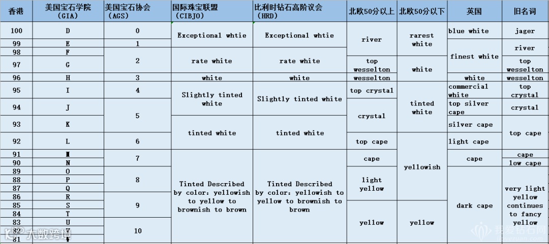 不同国家、地区的钻石颜色等级划分标准如下图: