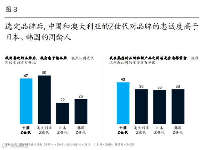 Z世代更倾向于对他们选择的品牌保持忠诚。47%的受访者表示会忠于自己喜爱的品牌,43%称在熟悉的品牌和新品牌之间总是会选择前者(图3)。中国Z世代的品牌忠诚度不仅高于其他国家(尤其是韩国和日本)的Z世代,也高于中国的年长群体。