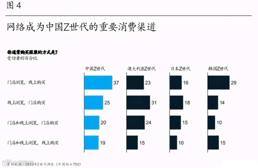 相比其他国家,中国Z世代更习惯于全渠道购物。以服装为例,近40%的中国Z世代消费者表示会去门店看实物,然后线上下单;不过,只有不到20%的中国Z世代消费者会同时在线上线下渠道浏览服装。