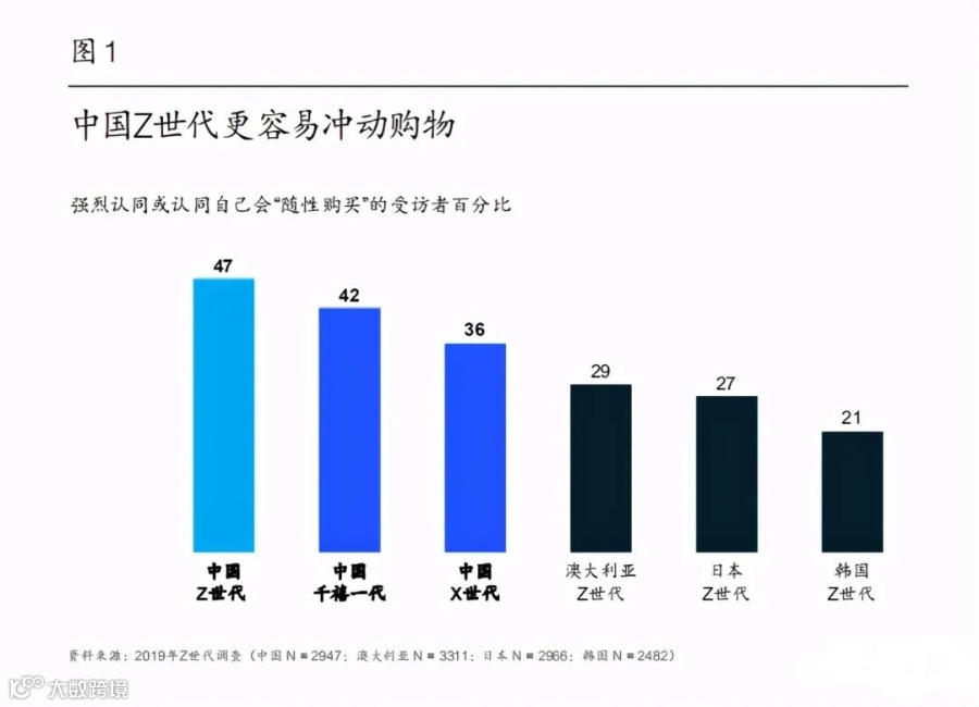 中国消费者比其他国家的同龄消费者更容易冲动购物。就连中国X世代消费者也比其他国家Z世代更喜欢随性消费。中国Z世代冲动消费的比例在全球首屈一指,47%的受访者表示会随性购买,比中国千禧一代(24~38岁)高5个百分点,比中国X世代高10个百分点。
