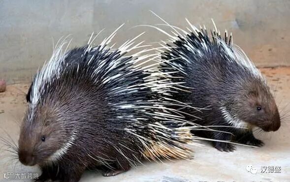 箭猪又称豪猪,体大,体形粗壮,是一种大型啮齿动物。其体重达10千克左右,体长约650毫米。上身披有硬棘刺,四肢及腹部的棘刺短小而较软;臀部的棘刺最长,约300毫米;尾甚短,隐于臀部长刺,通体棕黑色。刺一般呈纺锤形,中空,色乳白,中间1/3为浅褐色,刺表面有许多细长纵。豪猪天敌为渔貂,其怀孕期110天左右,哺乳期50天左右,通常一年两胎,一胎二仔。
