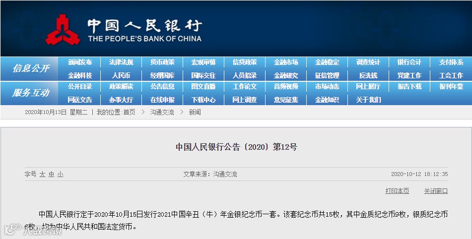还有两个半月2020就将翻篇了,为迎接纪念即将到来的牛年,中国人民银行将于10月15日发行2021中国辛丑(牛)年金银纪念币一套!