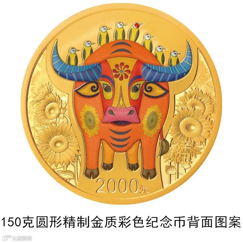 ▲150克圆形金质彩色纪念币背面图案为装饰牛造型衬以向日葵等组合设计(局部彩色)