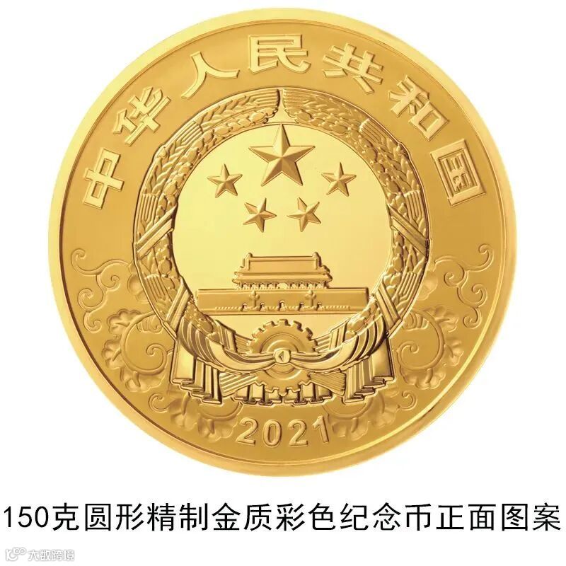 150克圆形金质彩色纪念币为精制币,含纯金150克,直径60毫米,面额2000元,成色99.9%,最大发行量1000枚。
