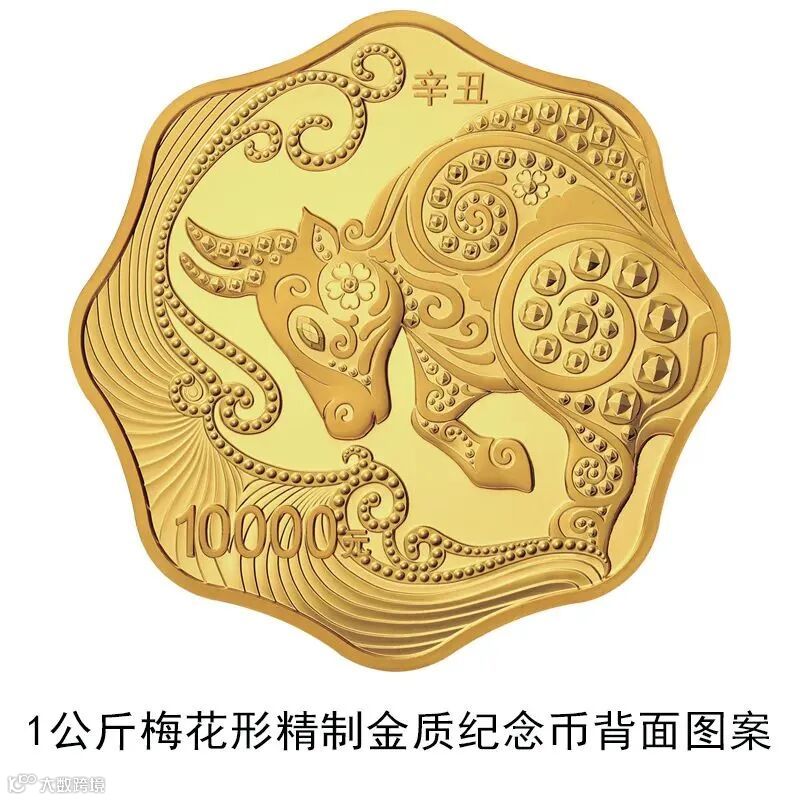▲1公斤梅花形金质纪念币背面图案为装饰牛造型衬以装饰纹样