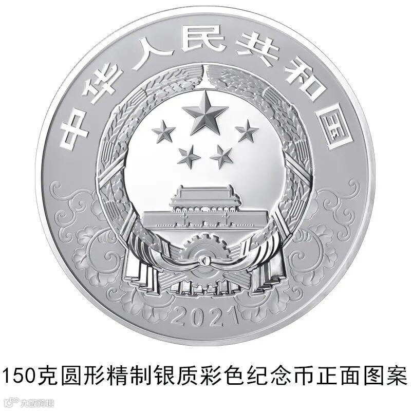 150克圆形银质彩色纪念币为精制币,含纯银150克,直径70毫米,面额50元,成色99.9%,最大发行量10000枚。