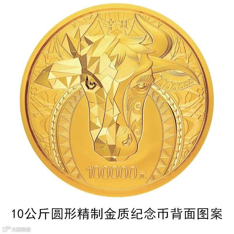 ▲10公斤圆形金质纪念币背面图案为装饰牛头造型衬以装饰纹样