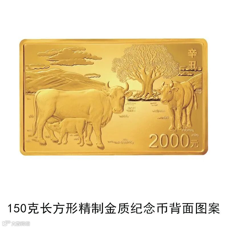 ▲150克长方形金质纪念币背面图案为写实牛造型,衬以树、远山等组合设计