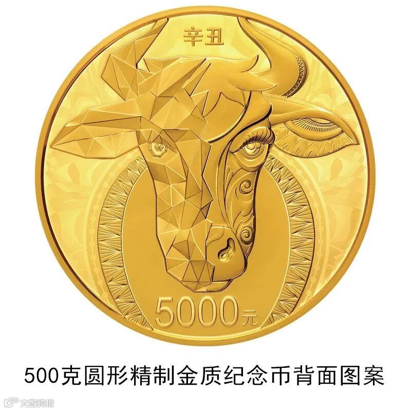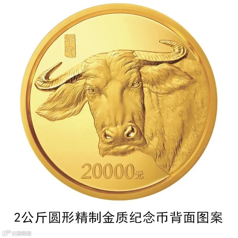 ▲2公斤圆形金质纪念币背面图案为写实牛头造型