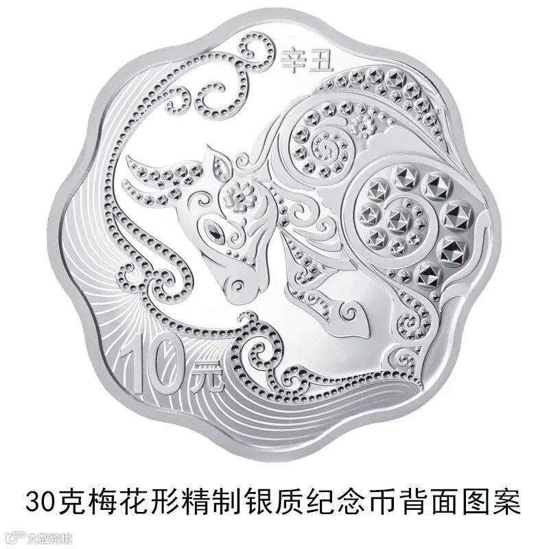 ▲30克梅花形银质纪念币背面图案为装饰牛造型衬以装饰纹样