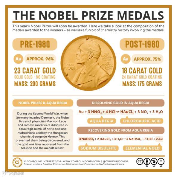 早期的诺贝尔奖章用23K金制成,也就是说,金含量是大约96%。到1980年代就缩水了——奖章变成了18K金制,外面有24K金的镀层。而且奖章的重量也有所下降,从200克改成了175克。