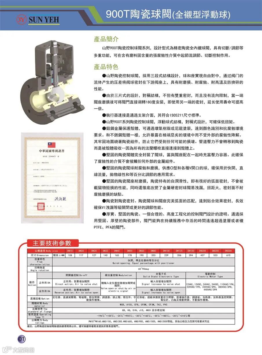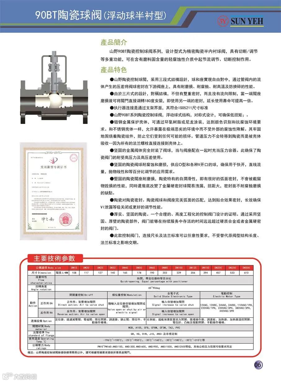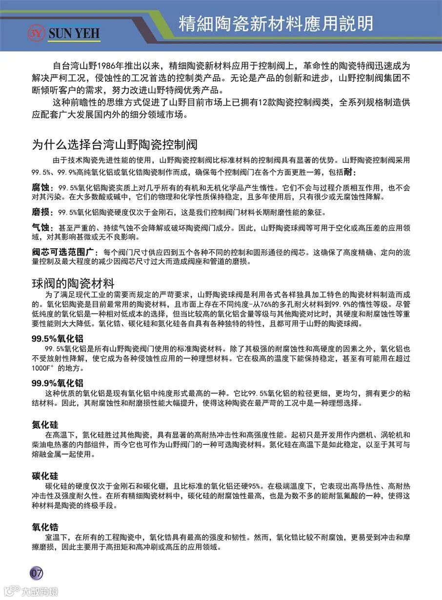 山野公司不仅结构陶瓷阀做得好,同时致力于稀材(有:钽、锆、镍、钛) 和耐磨结构陶瓷(有:氧化锆、氮化硅、碳化硅、氧化铝) 和 衬里(有:PTFE、PFA) 相结合 的 特种阀门和内衬管道件的应用与开发,主要有调节阀、开关阀,自力式减压阀、闸阀、截止阀、蝶阀、止回阀、球阀等产品。特别是专有技术的陶瓷球阀,充气膨胀陶瓷芯球阀、C型阀、偏心旋转阀,提升杆轨道C球阀和陶瓷内衬耐磨管道件等,均取得众多大项目批量应用的业绩。