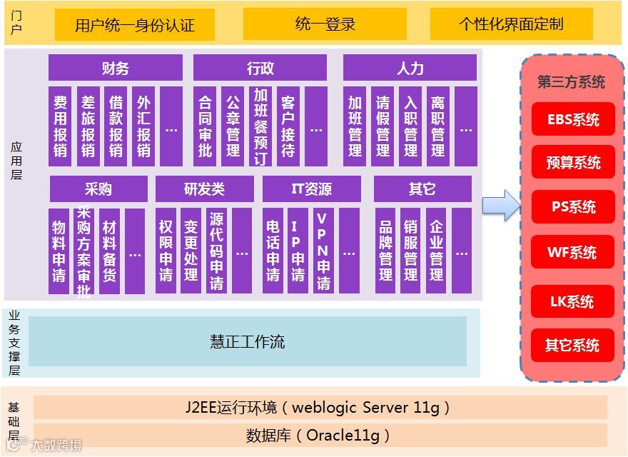 4、实现包括总部、分子公司及海外公司的财务管理、人力管理、行政管理、采购管理、企管、IT资源管理等实现约70个流程自动化;